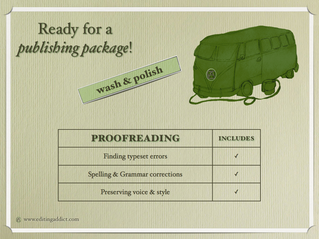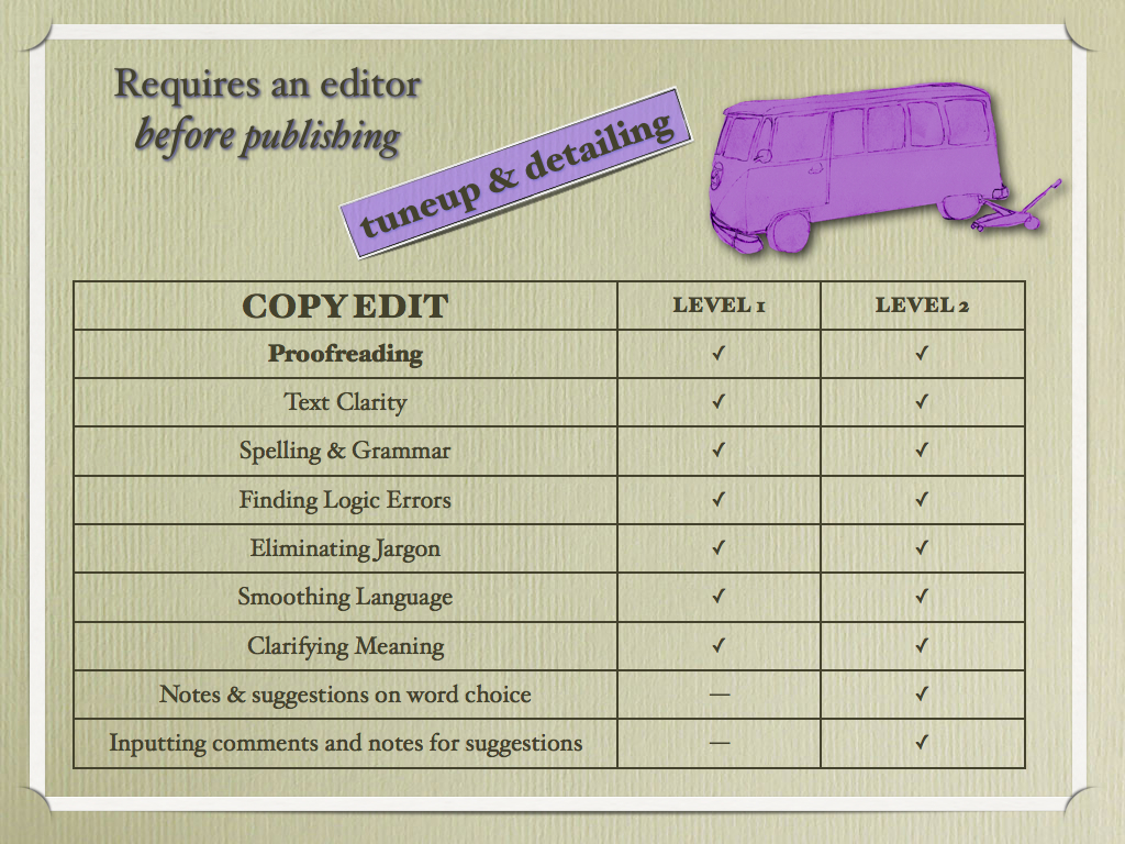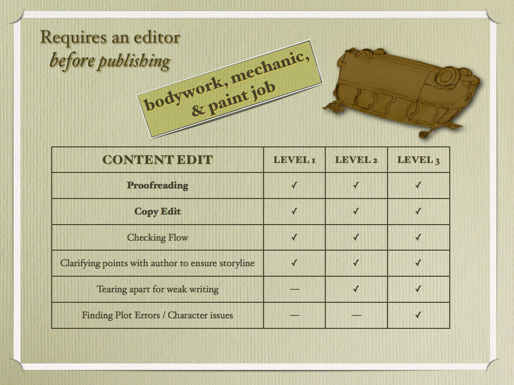 How much your editor will do for your book, is dependent on which level of editing you have paid them for—just like taking care of your vehicle. If you take your car to a car wash, but you really wanted them to replace your muffler, you are going to be surprised. More than likely, they will leave a note on your receipt that you have a muffler dragging behind your car—but they will not have done anything for it, except wash and polish it. Know what you need (which editing package) and then be willing to pay for what you need. It will be worth it.